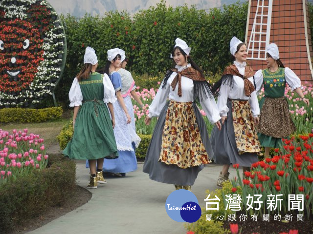 邁進第13年的后里區中社花市鬱金香季,二十八日正式開幕,美、俄及台灣穿著荷蘭服飾…