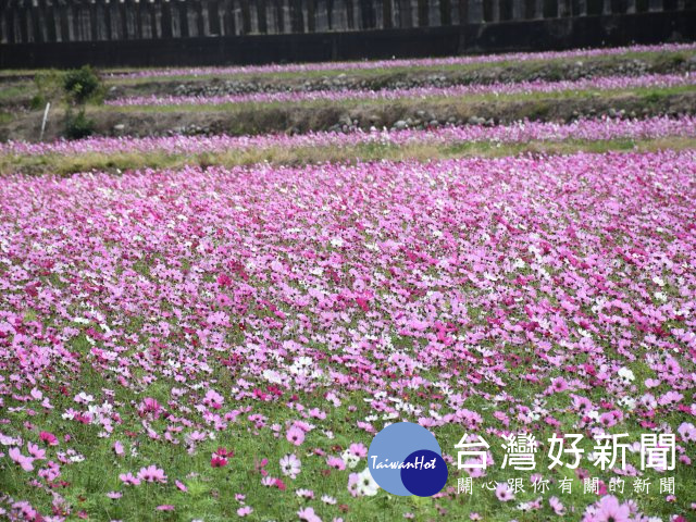 中市海線地區農田,境路旁田間,七彩花卉迎風搖曳,花香四溢、紅綠相映的波斯菊美極,…