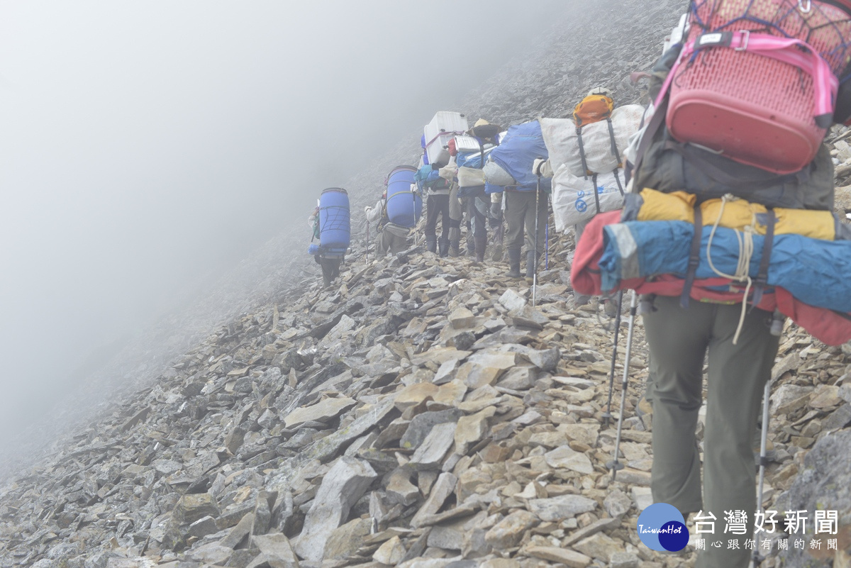 志工清運垃圾下山。〈圖片玉管處提供〉 都市生活的壓力,使得許多人開始走入山林,透…