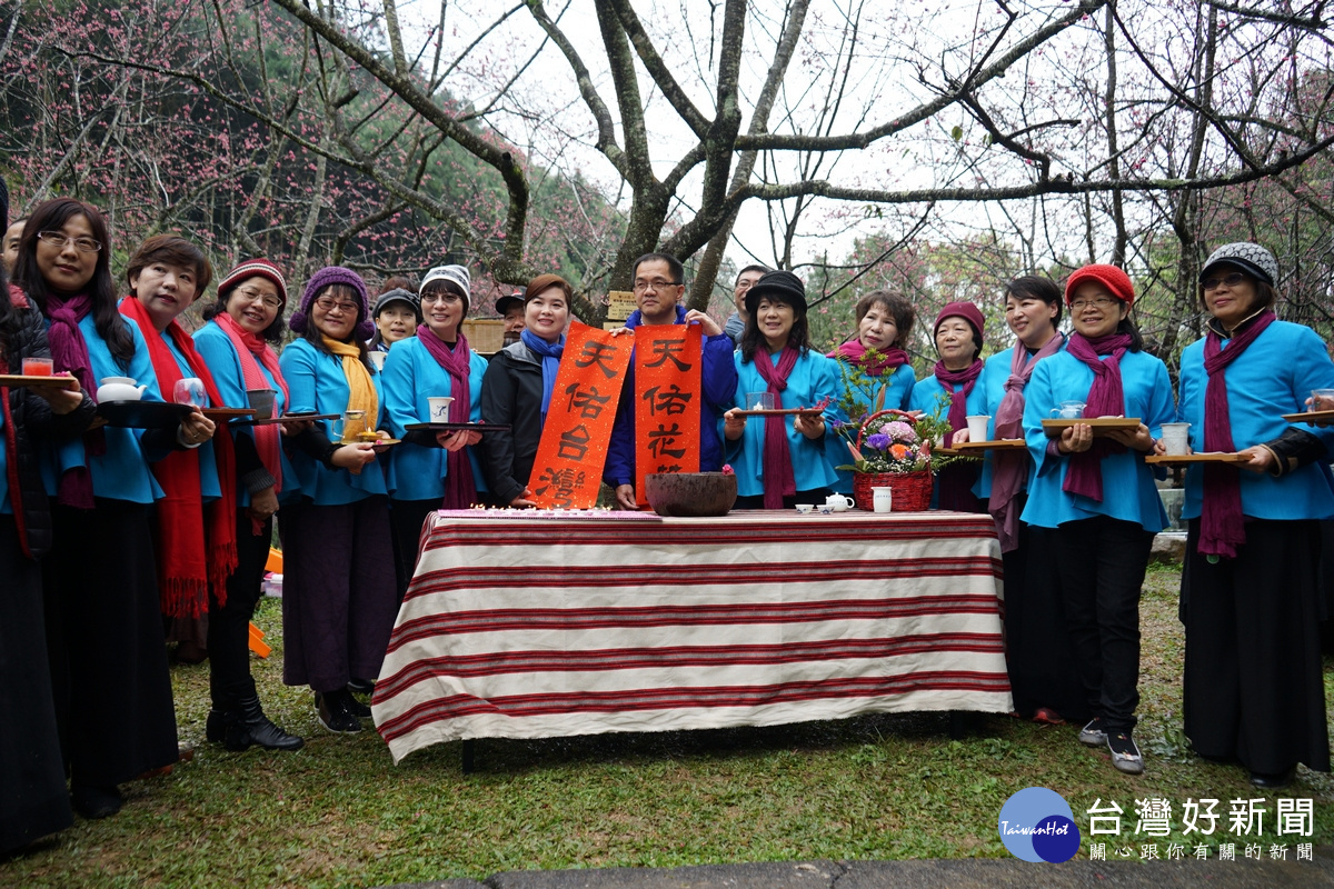 茶師們齊聚九族櫻花湖畔櫻花樹下,並由魚池鄉公所鄉長夫人王秋淑,代表陳錦倫鄉長致詞…