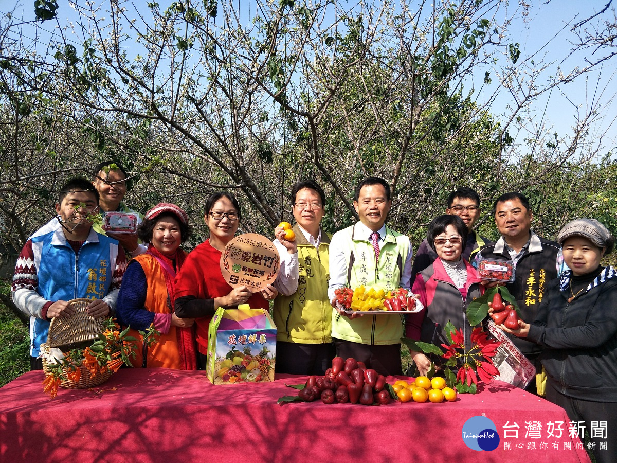 花壇鄉長李成濟帶著農民行銷優質水果。圖/記者鄧富珍攝 賞梅不必到南投信義鄉, 彰…
