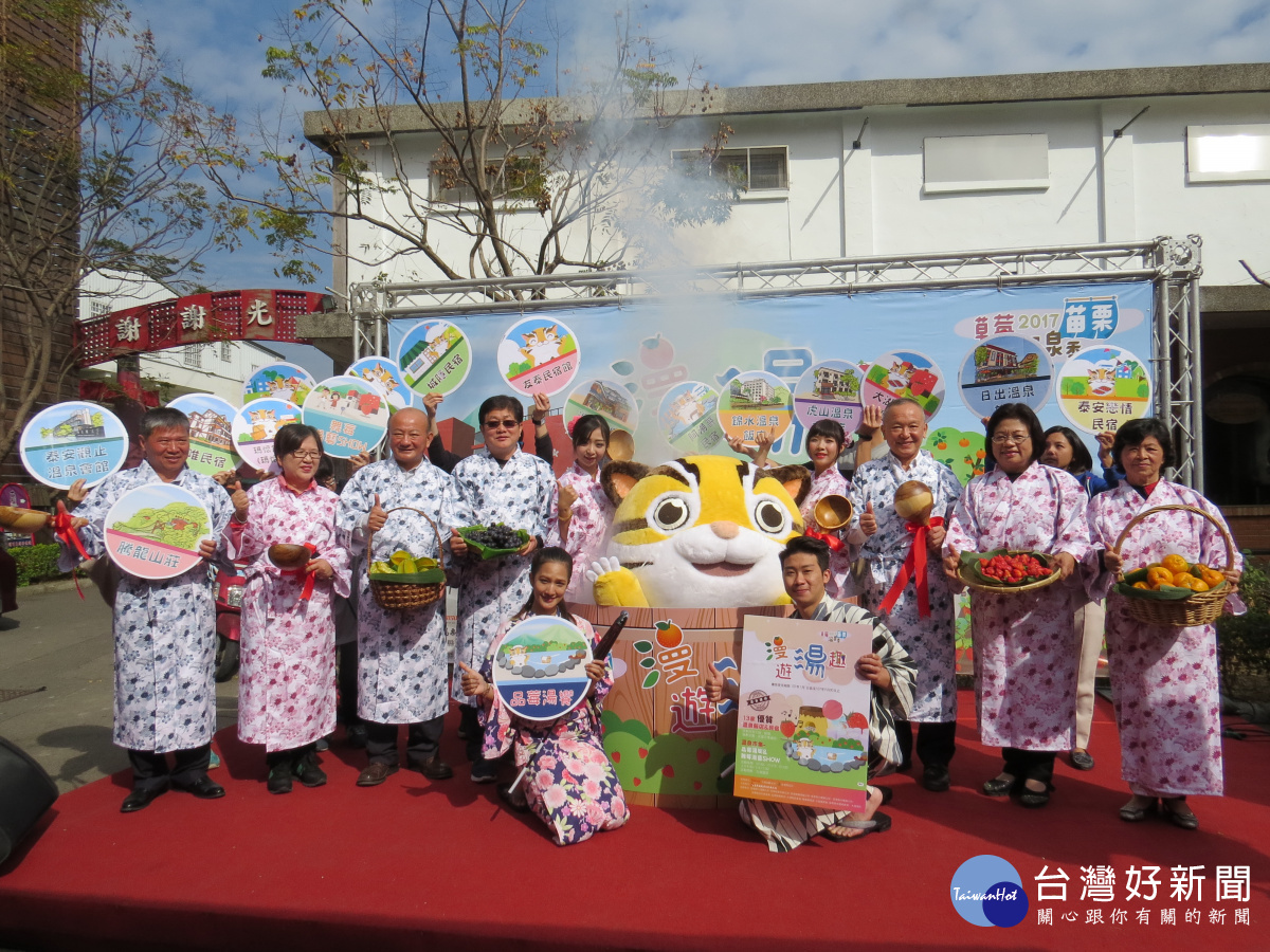 苗栗草莓溫泉季開跑,縣長等人著「溫泉袍」為活動宣傳。(記者許素蘭/攝) 苗栗草莓…
