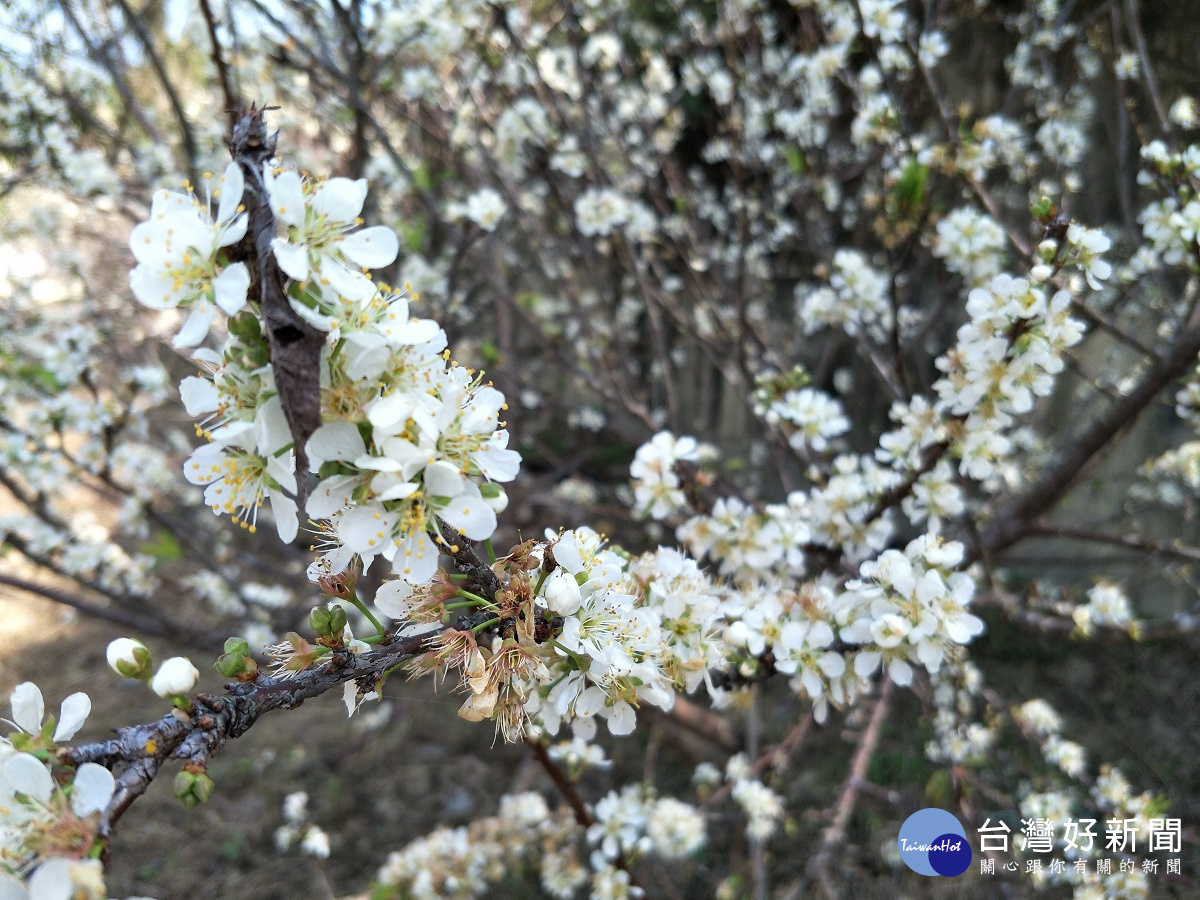 春節期間努力綻放的「李花」。圖/記者鄧富珍攝 春節前夕,梅花開完李花開,花壇鄉三…
