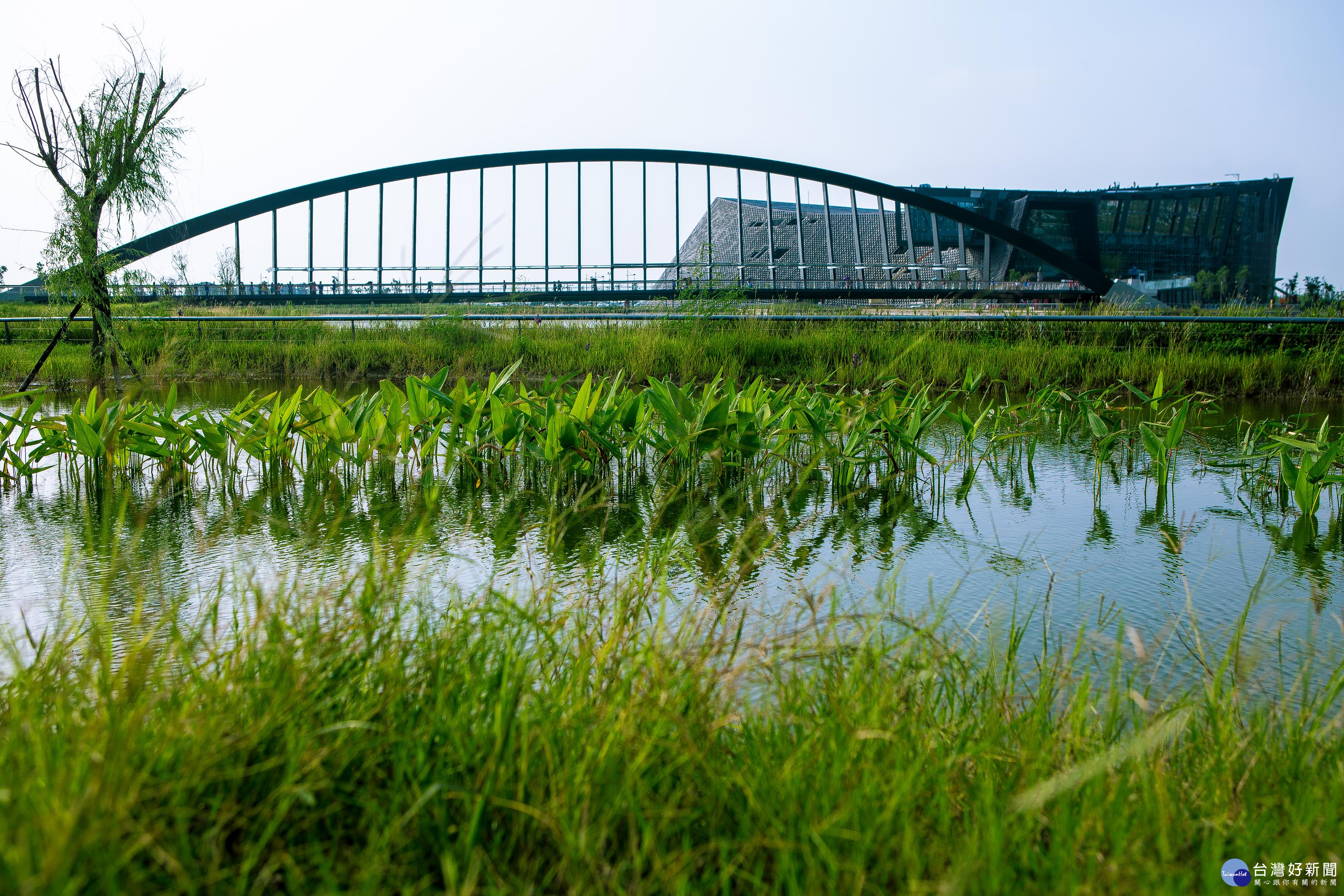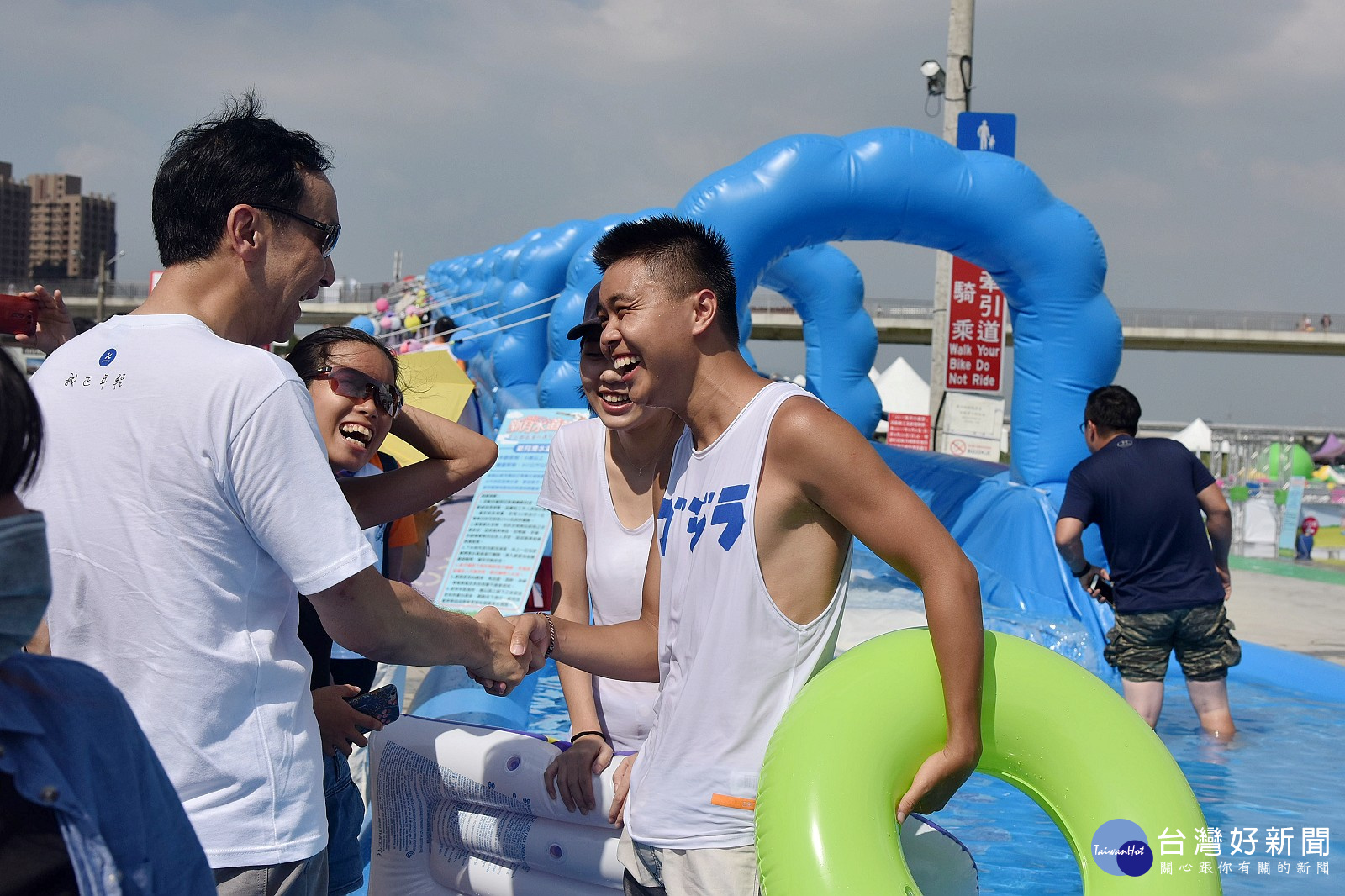 全國首創結合橋樑自行車牽引道設置大型滑水道的新北市「新月水道節」,12日由市長朱…